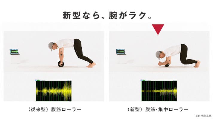 従来の腹筋ローラーは腕の筋力も大きく使ってしまいます。「腹筋・集中ローラー」は、腕の負担を抑える設計。そのぶん腹筋だけに集中できます。