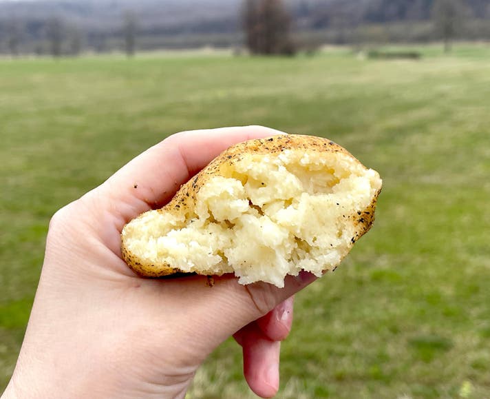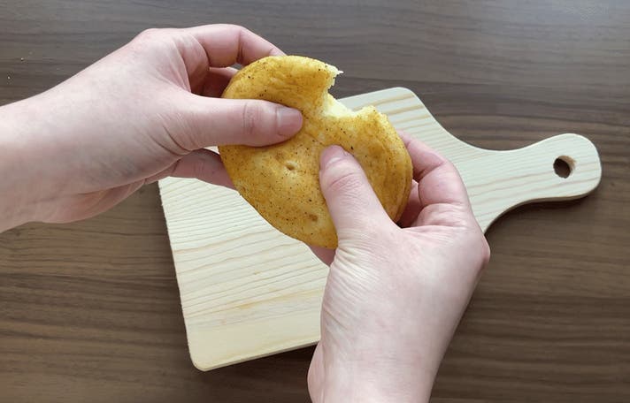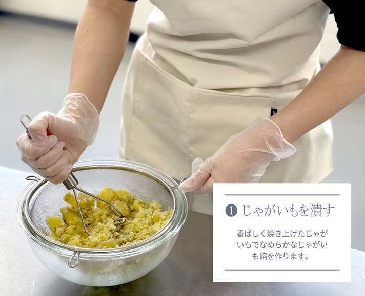 - グルテンフリーのもちもち生地に、なめらかじゃがペーストを包みました!