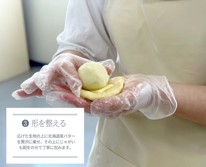 「生じゃがバターパン」は地元の素材を贅沢に使用しています。北海道の大地が育んだ上質な男爵いもに、北海道産のバターをたっぷりと。素材そのものの良さを活かして丁寧に仕上げました。