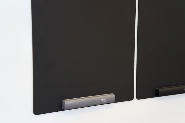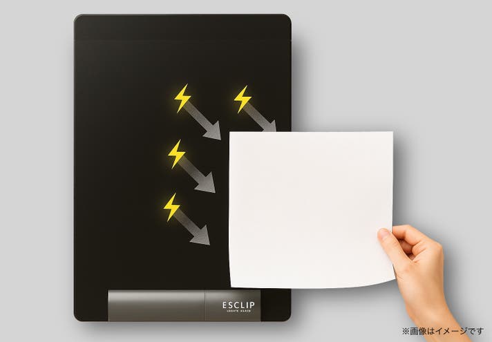 ESCLIPは、静電気で紙を貼りつけることができるので、画鋲・テープが不要で資料も壁も傷つけず、繰り返し使用可能。