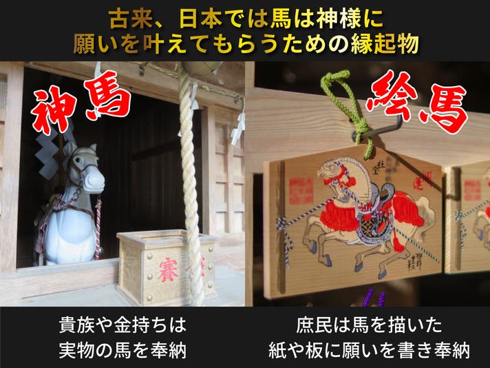 日本では古くから馬は神様の乗り物。『日本書紀』では願い事をする時に馬を奉納したとあり、現在でも「神馬」を奉納する神社があります。