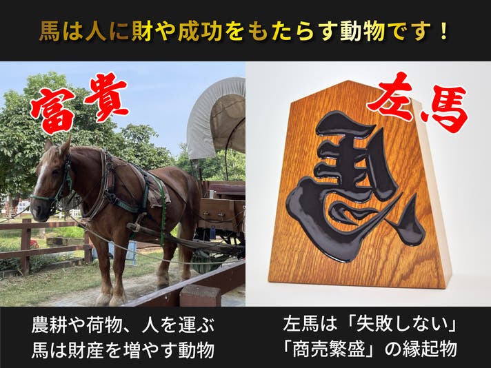 さらに馬は左から乗ると落馬の失敗が少ないことから、馬が左を向く姿は「万事、うまくいく」縁起の良い意匠として、将棋駒で有名な天童の「飾り駒」の起源にもなっています。