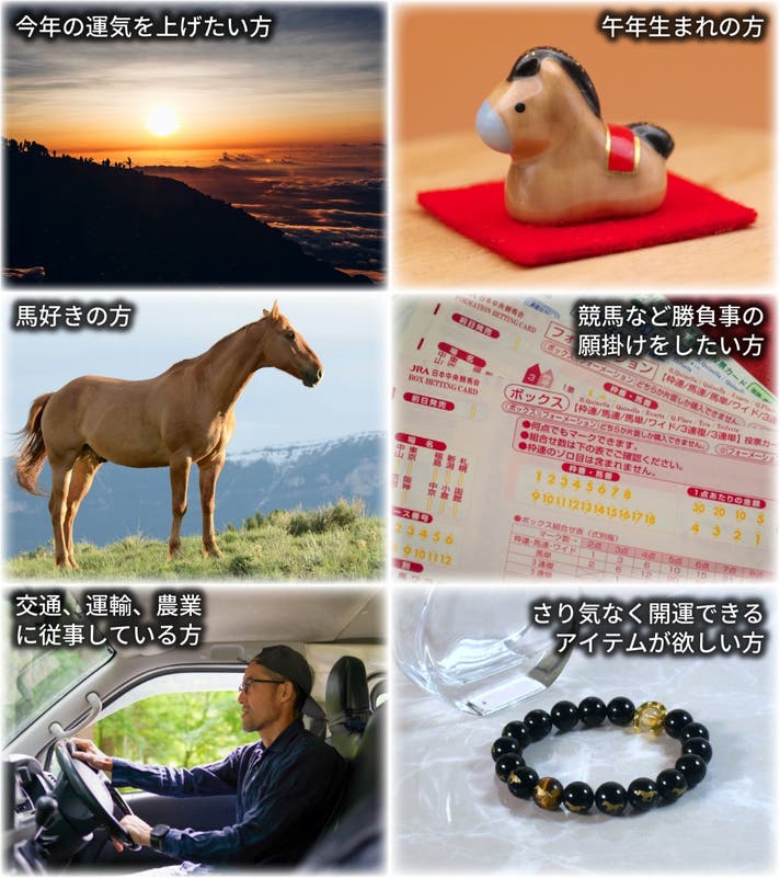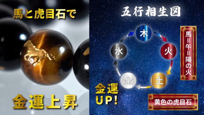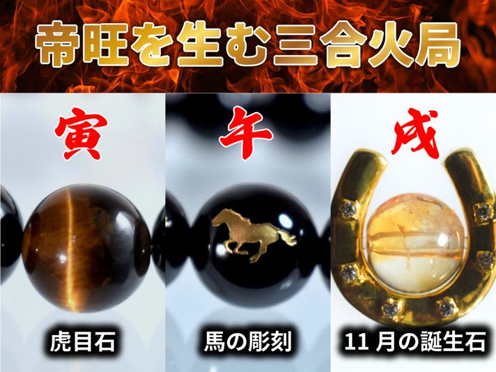 - 馬、虎目石(寅)、黄水晶(戌)の配置で算命学の三合火局を形成し、丙午の年の運気上昇を後押し。