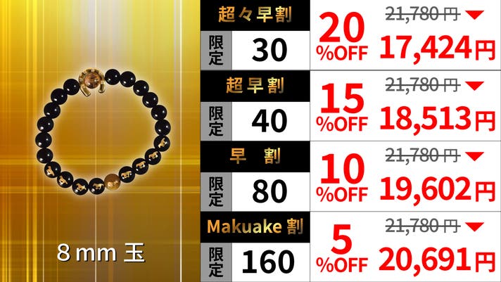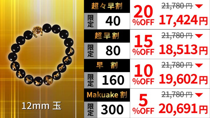 「Makuake(マクアケ)」は、実行者の想いを応援購入によって実現するアタラシイものやサービスのプラットフォームです。このページは、 ファッションカテゴリの 「午年は「馬」の縁起で開運祈願!60年に一度の大運気到来を干支ブレスレットで後押し」プロジェクト詳細ページです。