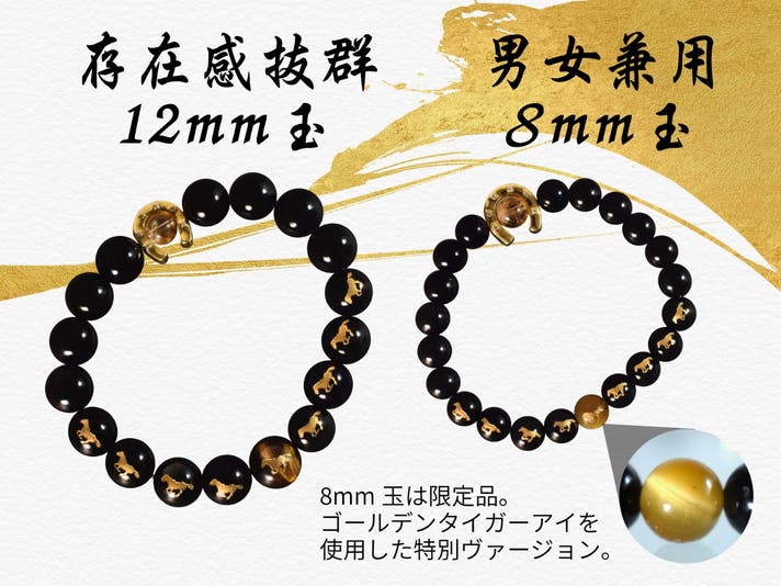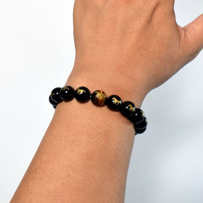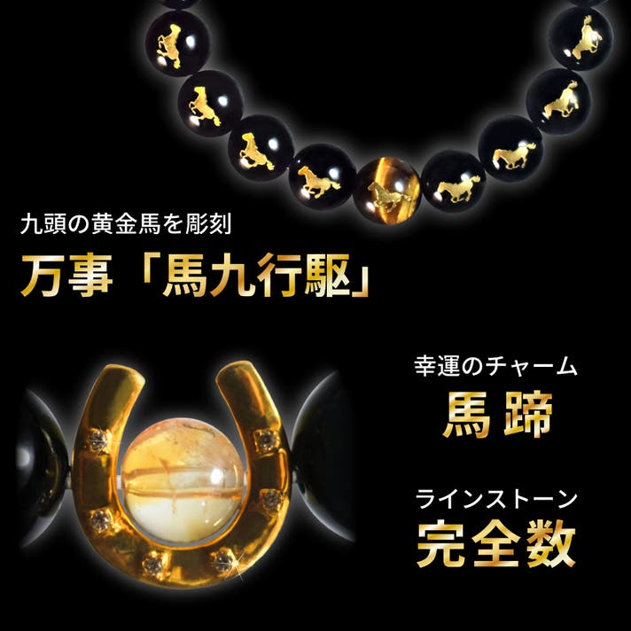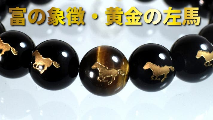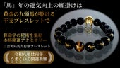 『三合火局馬九行駆ブレスレット』にはパワーストーンのビーズに2026年の干支「馬」をレーザーで彫刻し、ゴールドのエナメル塗装を施しました。