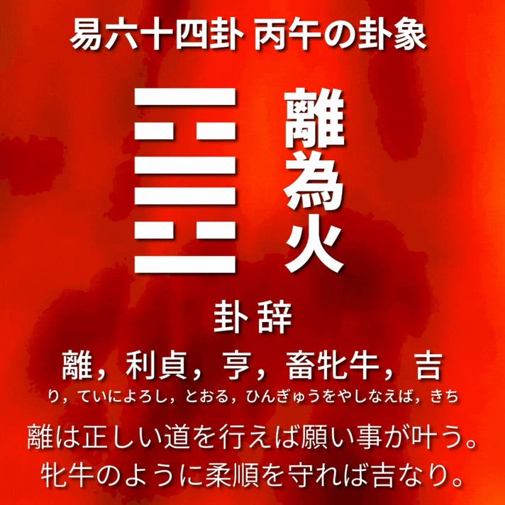 さらに東洋占いの基本経典『易経』で、「離為火」の意味を総括する卦辞は「願い事が叶う大吉」を暗示しているのです。