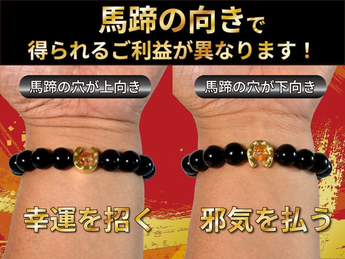 馬蹄を上向きにして装着すれば幸運を招くラッキーチャームに。下向きにして装着すれば魔除けや交通安全の御守に。用途に合わせてお使いいただけます。
