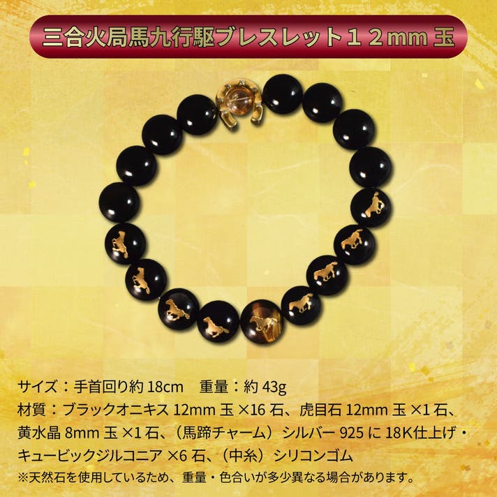 『三合火局馬九行駆ブレスレット』の主玉には古くから悪運を断ち切る魔除けのお守りとして使用されるパワーストーン、ブラックオニキスの12mm玉を使用しました。