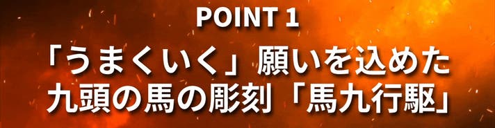 それぞれの馬は勝負運・招財運・出世運・家庭運・愛情運・健康運・商売繁盛・豊漁豊作・受験合格を意味しています。