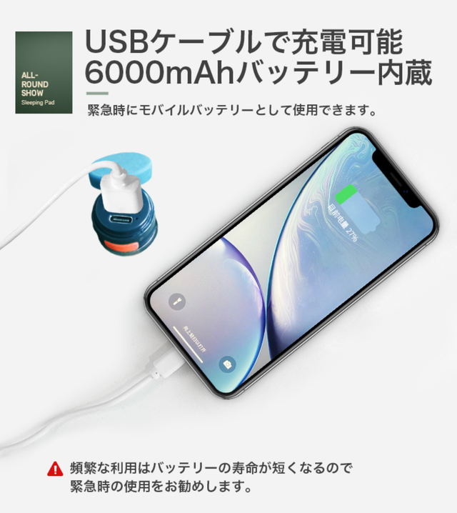 - 6000mAhバッテリー内蔵!USB充電ができ、緊急時にはモバイルバッテリーとしても使用可能!