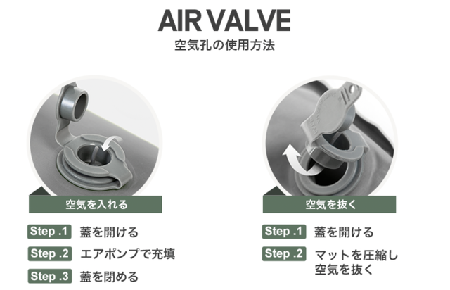 内蔵のエアポンプでは不十分な場合、別途エアポンプをご用意いただき、満タンまで空気を入れることもできます。特にダブルサイズは空気の容量が大きいため、別途エアポンプの使用をお勧めします。