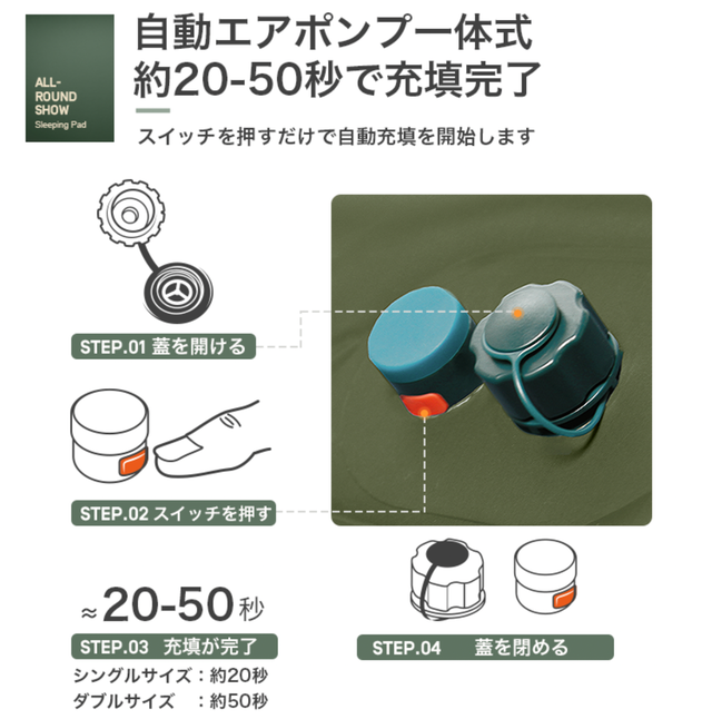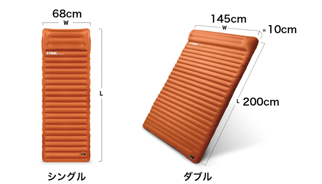 - スイッチを押すだけで空気を自動で充填!シングルとダブルの2サイズ展開!アウトドアや災害時に!
