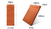 サイズはシングルとダブルから選ぶことができ、空気を抜いて収納をすると、持ち運びし易いコンパクトサイズになります。ダブルサイズはもちろん、シングルサイズも連結することで、広々とカップルや家族で楽しむことができるので、アウトドアグッズとしてオススメです!前作からバーションアップして登場です!