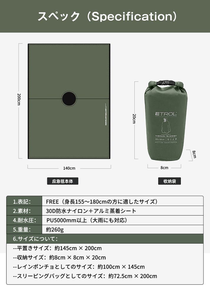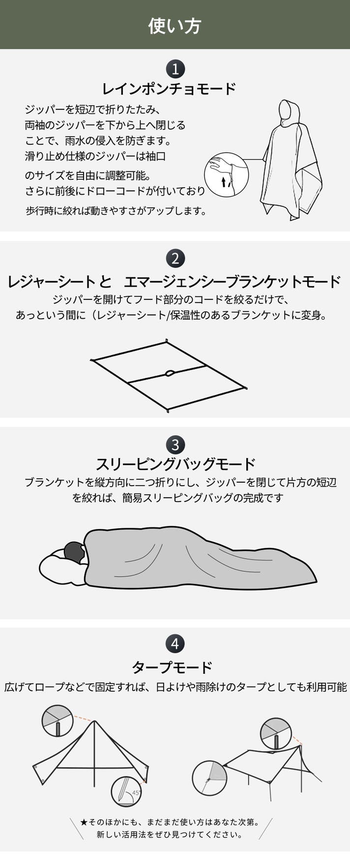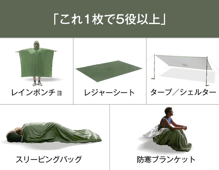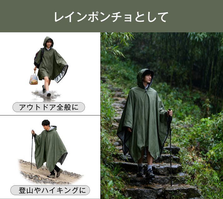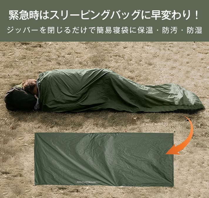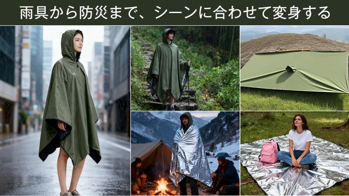 - 緊急時にも心強いの多機能設計:レインポンチョ・ブランケット・スリーピングバッグなど1枚で活躍