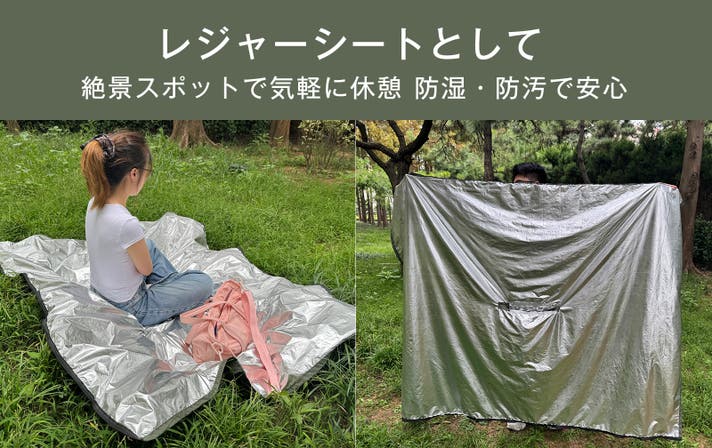 ハイキング中に突然の雨に降られても、すぐにレインコートとして活躍し、中小雨なら問題なし。寒さや体温低下に見舞われたときは、羽織るだけで温かさを守ってくれます。暑い日には、簡易シェルターとして設置でき、安心して休める空間に。美しい景色に出会ったときや少し休みたいときは、広げれば清潔で快適なグラウンドシートに。キャンプでは保温スリーピングバッグやインナーとして使え、湿気や汚れからしっかり守ってくれます。