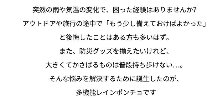 「Makuake(マクアケ)」は、実行者の想いを応援購入によって実現するアタラシイものやサービスのプラットフォームです。このページは、 プロダクトカテゴリの 「1枚5役!雨具から防災まで、シーンに合わせて変身する多機能レインポンチョ」プロジェクト詳細ページです。