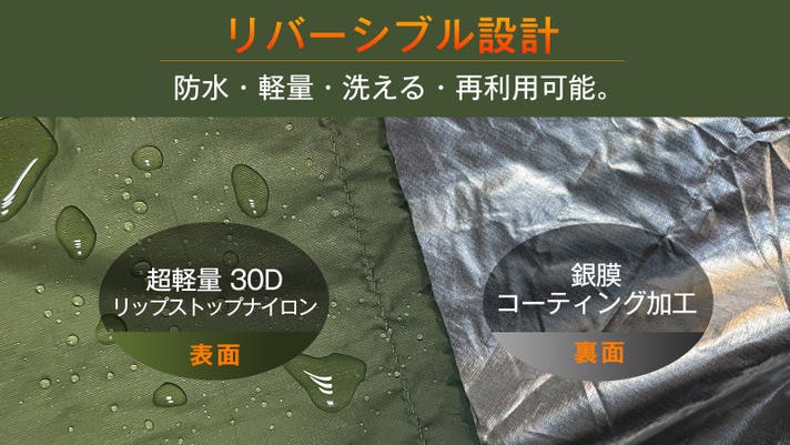 - 高機能素材で頼れる:30Dリナイロン+シルバーコーティング。防水PU5000mm+、保温・防水