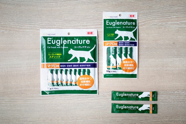 そのユーグレナを使用した第一弾の商品が「ユーグレナチュレ」です。ユーグレナの持つ豊富な栄養素を利用して、添加物・着色料を使用しない無添加として、しかもとびきりおいしい商品を猫ちゃんのために開発しました。