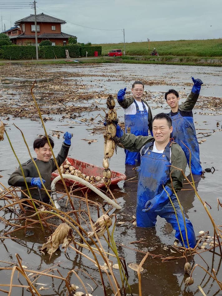 蓮根を収穫する職人たちとれんこん三兄弟の宮本社長(左)