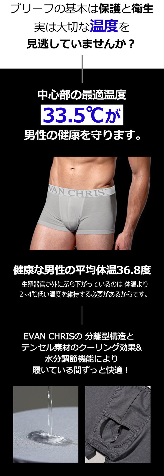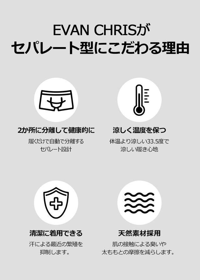 EVAN CHRISは、天然素材を使ったセパレート型アンダーウェアです。男性の健康を守る通気性の良い作りとなっており、高級感のあるデザイン、快適な素材など、優れた機能性が特徴のメンズアンダーウェアブランドです。