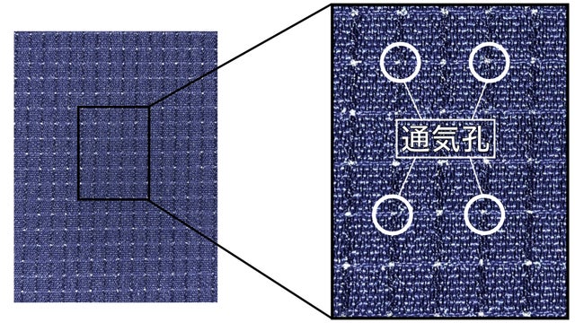 布帛の生地に特殊な製法で通気孔を出現させることで、通気性をUPさせ、生地自体も軽量化しています。さらに後加工で撥水性を加え、最強の生地へとアップデートさせました。