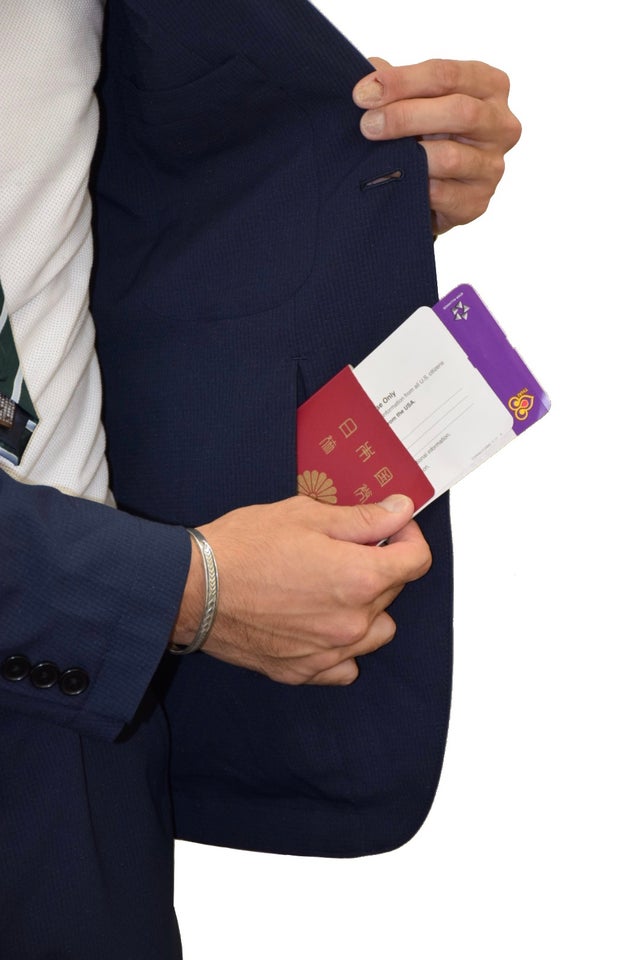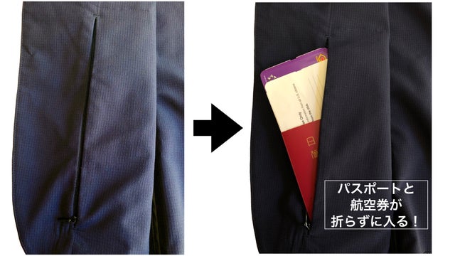 特にこだわったポイントは、下の2箇所の内ポケットの深さです。長財布や航空券がそのまま入るほどの深さがあります。私たちも海外出張の際、航空券を折ることをためらっており、そのままジャケットにしまうことができればと思い、ポケットの深さにはこだわりました。