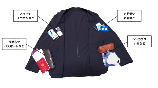 「1秒スーツ」のデザインの1番のポイントは、4箇所の大容量の内ポケットです。スマホ・財布・ハンカチ・イヤホン・・・全て収納することができます。3箇所のポケットにはファスナーを付け、荷物が落ちにくくしました。