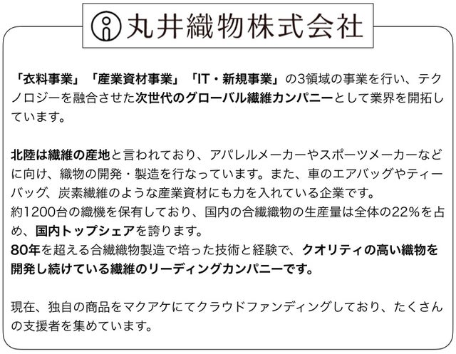 1秒スーツの生地は丸井織物株式会社の国産の特殊な生地を使用しています。