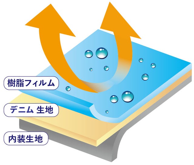 単純にデニムを使用するだけで無くひと手間加えることで、更に鞄としての機能性を向上させることに成功しました。デニム地の上に樹脂フィルムを圧着させることにより、 耐水圧10000ミリ以上の撥水性を実現しました。これは生地1cm四方に水柱10メートルを立てても漏水しないことを示します。種類にもよりますがレインウエア以上の撥水性を持ち合わせています。