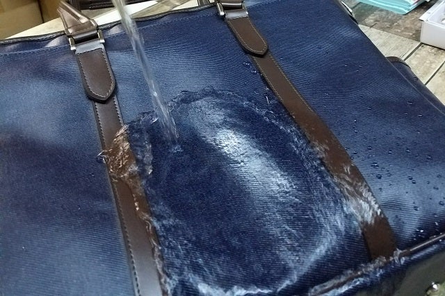カバンは縫製や開口部分など防水仕様にする事は難しいのですが、生地の撥水性は非常に高く水をかけてもなかなか浸透しません。(カバンではなく、あくまで生地自体の撥水性ですので雨にはお気をつけ下さい)