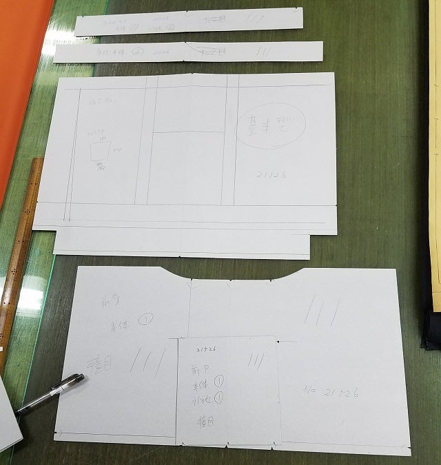 これが型紙で全ての工程がこれを元に進んでいきます。どのようにしたら鞄の形が美しく見えるか長年の経験が物を云う作業です。これを間違えるとおかしな形の鞄になり美しく見えません。