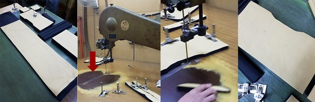 上記画像の一番左が裁断機でカットした状態です。カットした生地を「バンドナイフ」という機械で更に細かくカットしていきます。矢印の方向に時計回りで細い巨大な刃が回っています。曲線部分も全て職人さんの感覚でカットしていきます(作業のスピードと断面の美しさは衝撃です)。一番右の画像の状態で縫製工場に運び込まれます。