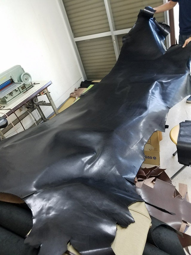 これは革をカットする前の状態です(色はブラックです)。この革をカットしてそれぞれの部品の形にしていきます。