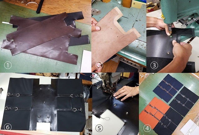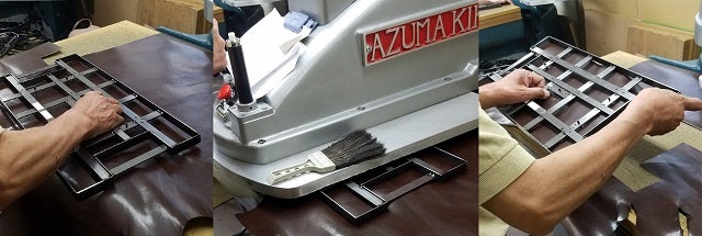 上記の画像は鞄底部分の革をカットする作業です。革はナイロンと違い金型を作って上からクリッカーという機械で圧力をかけ一枚一枚抜いていきます。