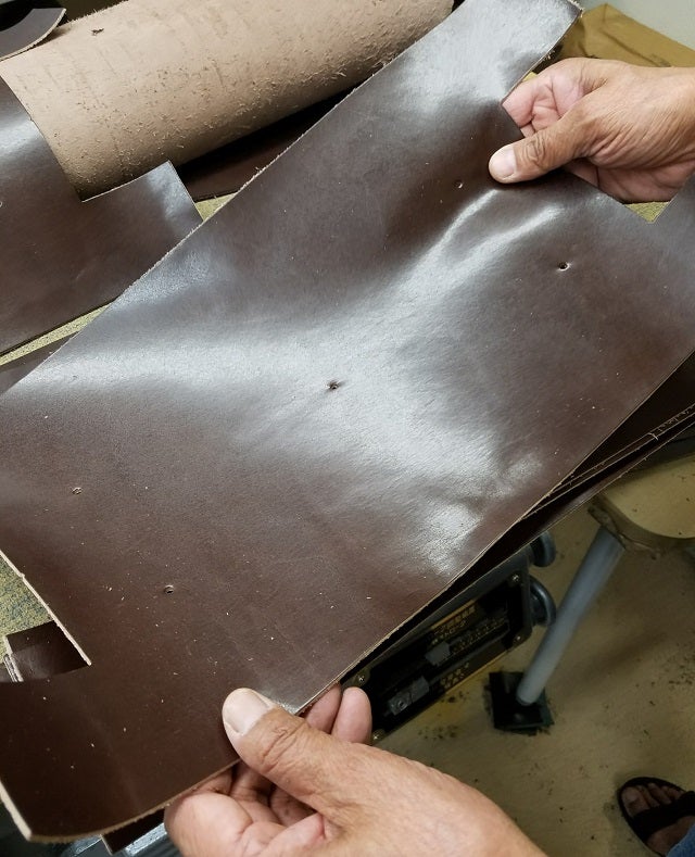 次は革の裁断です。この鞄の特徴でもあるのですが牛革を贅沢に使用しています。これもポイントで牛革を使うことにより美しさ、更に使い込んだときの味わいが合皮とはまったく違ったものになります。