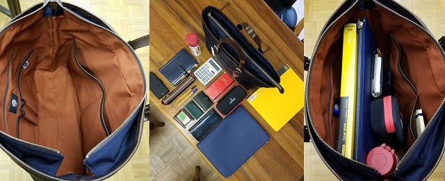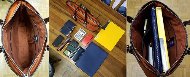小サイズの内装は、オープンポケット×4・ファスナーポケット×1です。大型ファイル(25×31×3cm)やドキュメントケース(26×34×2cm)も入ります。鞄の外側はオープンポット×2です。