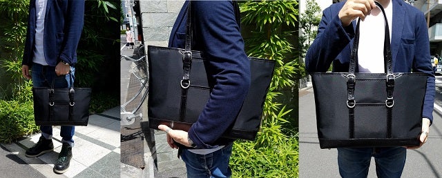 小サイズ≪ブラック≫使用イメージです。真ん中と右側の画像はハンドルを一番長く伸ばした状態です。