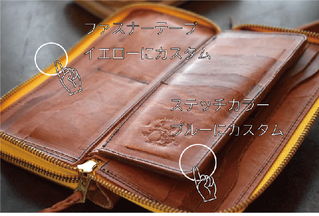 好みのカラーリングに革素材・ステッチカラー・ジッパーテープカラーをご選択。革蛸オリジネーターが貴方だけの財布をお仕立てさせて頂きます。
