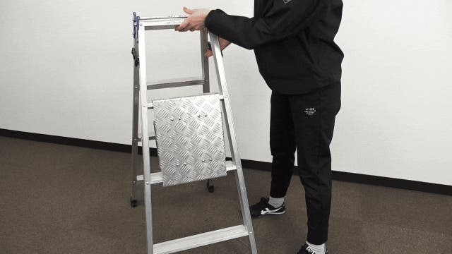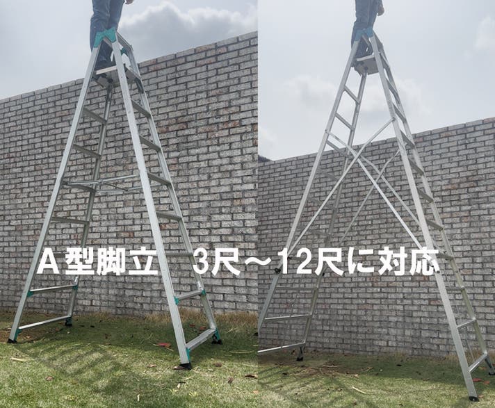A.ホームセンターで一般的に販売されている職人さんも使うA型脚立、3尺(0.9M)~12尺(3.6M)に対応しております。ただし、造園業者さん等が使う三脚脚立や梯子には対応しておりませんのでご注意ください。