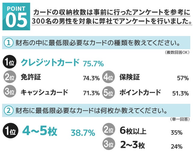 このアンケート結果を参考にカードポケットは6枚分ご用意して製作しております。さらにカードを収納したい場合はフリーポケットをご利用ください。