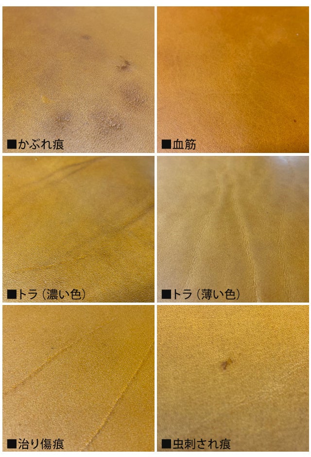 市場のほとんどの革はこれらの痕を分かり辛くするために表面に顔料を塗り、隠していますが、