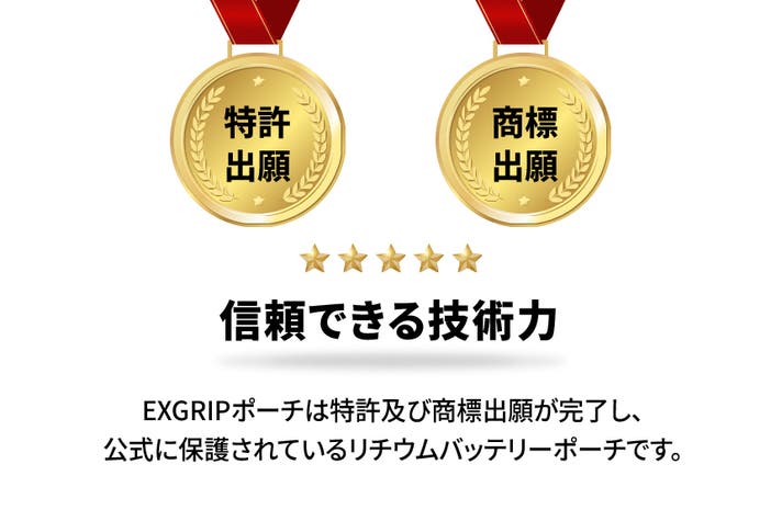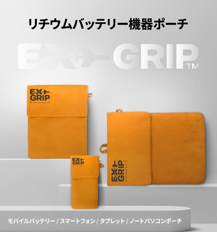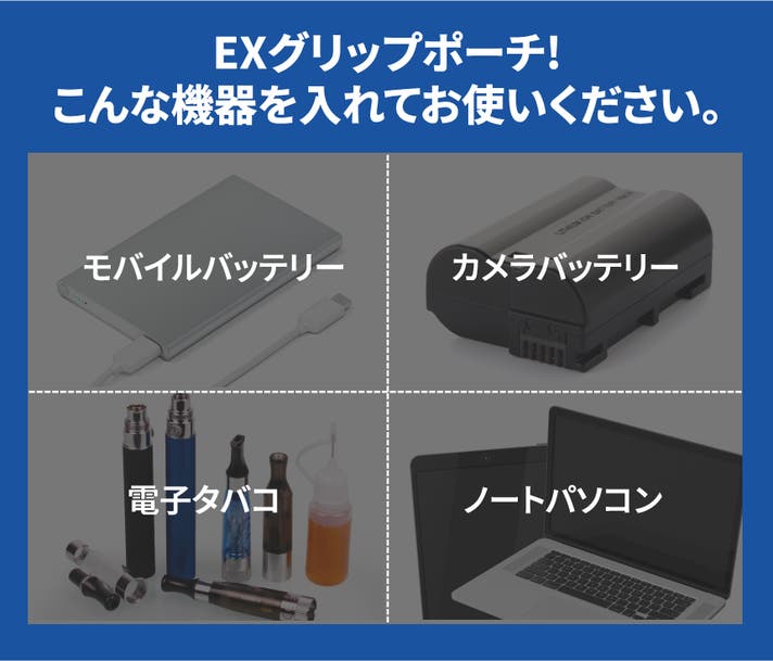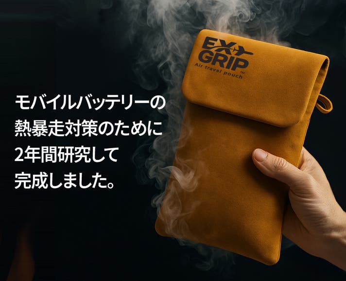 A. EXGRIPは、モバイルバッテリーやノートパソコン用バッテリーを収納することで、バッテリー発火·熱暴走に対応したポーチです。 特殊3層構造生地と耐熱性に優れた縫製でバッテリー熱暴走時初期発火温度800℃の高温にも耐えられます。