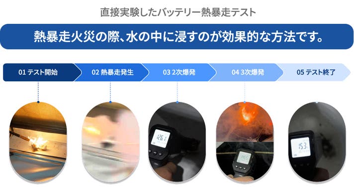 結局、熱暴走が発生する前に発生する前兆現象である煙、臭いで異常兆候が発生した時に、1次熱暴走が発生する前に落ち着いて移動または水中に浸かることが熱暴走に対する対応の第一歩です。