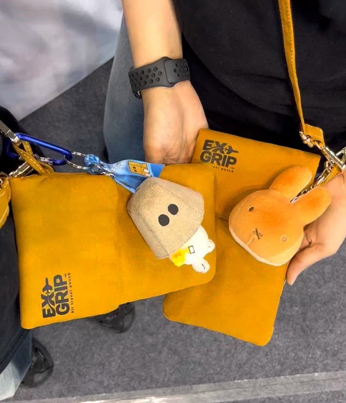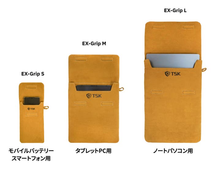 自社開発のEXグリップは、モバイルバッテリー·タブレット·ノートパソコンを入れられるポーチタイプで製作!