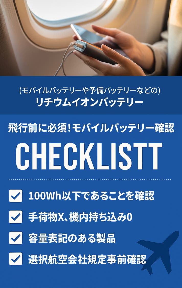 160Whを超えるバッテリーは、通常の商業航空便では持ち込み禁止です。 これを私たちがよく使うmAh(ミリアンペア時)単位に換算すると、100Whは約27,000mAh、160Whは膜43,000mAhに該当します(3.7V電圧基準)、したがってモバイルバッテリーの容量を確認し、機内持ち込みカバンに必ず入れることが重要です。