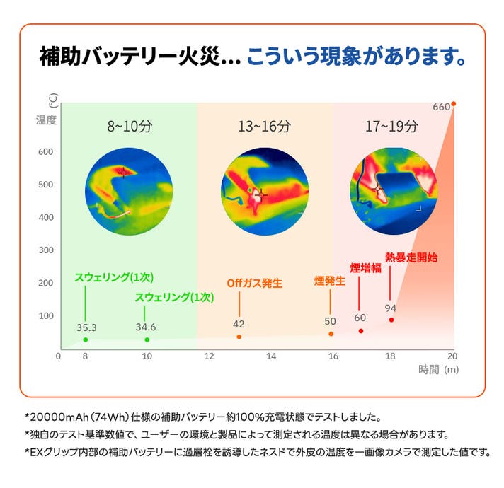 過充電、過放電、または内部短絡(Short Ctreult)が発生すると、バッテリー内部で異常な化学反応が起き、熱が発生します。
