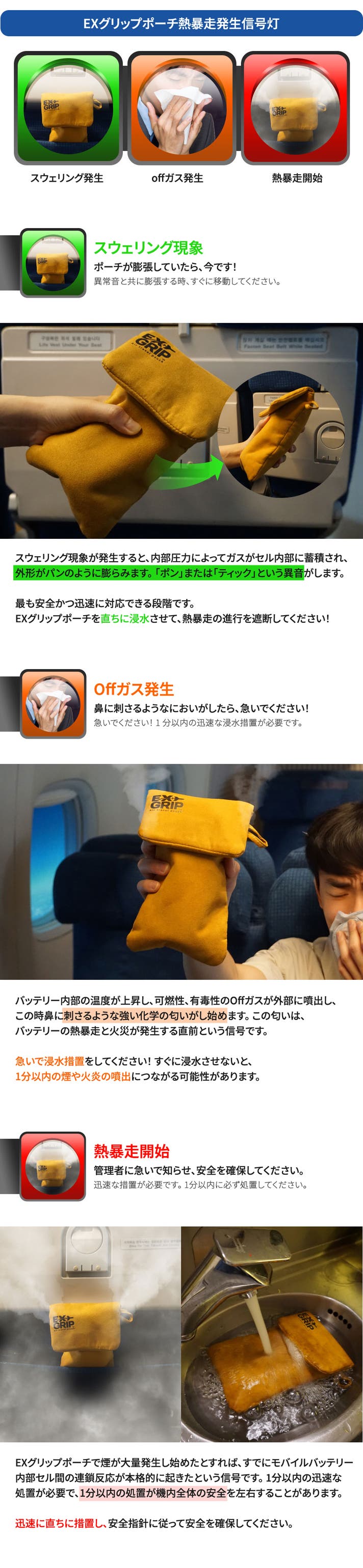 A. EX GRIPの中でバッテリーが熱暴走発生時には収納したまま片手で持って水中に浸水させると良いです。 浸水性スエード生地が素早く水を吸収するため、初期進化にも対応できます。