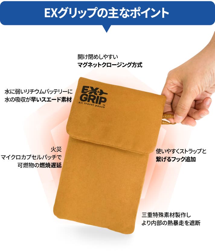 A. はい、機内持ち込みが可能です。 EX GRIPポーチは、補助バッテリーの保管に必要な国際基準(ICAO、IATAなど)を反映した外部短絡防止設計で、機内持ち込みに問題ありません。