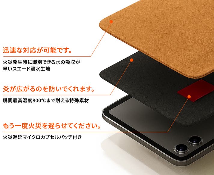 - ポーチ内部の特殊素材カプセルテープと吸水生地が発火時に素早く2次対応をサポート!