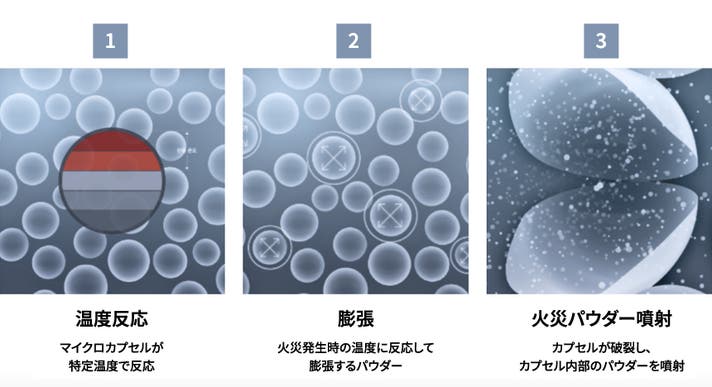 マイクロカプセルとは、微細なパウダーをマイクロカプセルに入れて火災発生時に高くなる温度を感知してマイクロカプセルが分離され、火災に備えたパウダーが自動噴射される製品です。